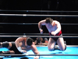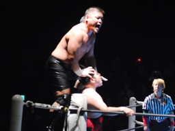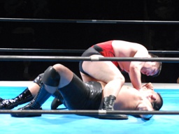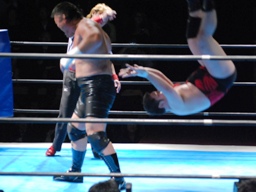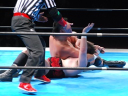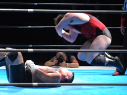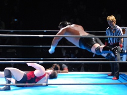 ロープに飛んでフォアアームドロップ(右写真)、カウント2。
