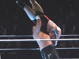 天山コーナーに上ってダイビングヘッドバット、アントンかわす(右写真)。