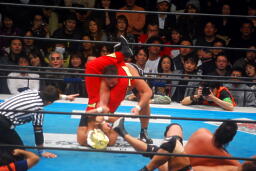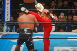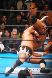 石井マスクはぎ(右写真)。ロープに飛ぶ、タイガーミドルキック、ソバット。天山にタッチ。天山ヘッドバット、モンゴリアンチョップ、ロープに飛ぶ、田中が足を引っ張り場外に。