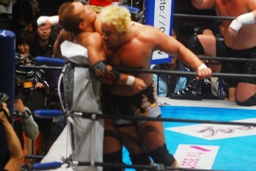 田中コーナーに振ってダンガンエルボー(左写真)。ブレーンバスターは天山が逆に投げるがタッチは阻止される。10分経過。