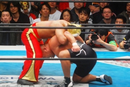田中コーナーに振って串刺しラリアット、真壁かわしてラリアット(左写真)。ロックアップ、田中自軍コーナーに押し込んで石井にタッチ。真壁もタイガーにタッチ。5分経過。