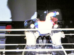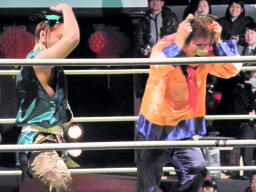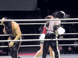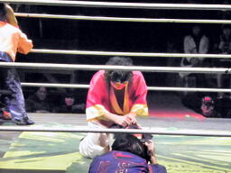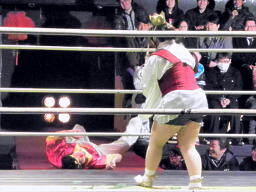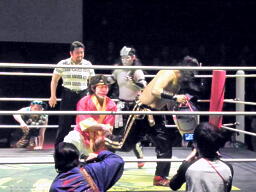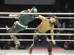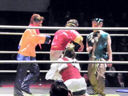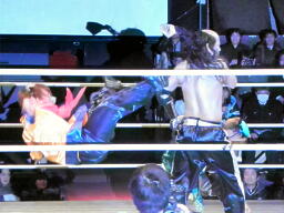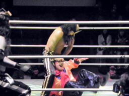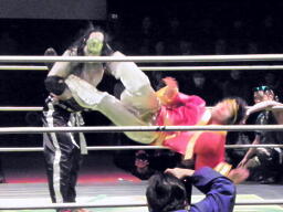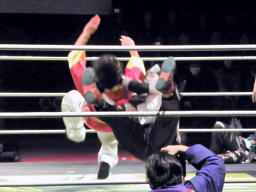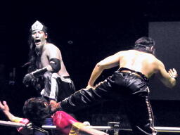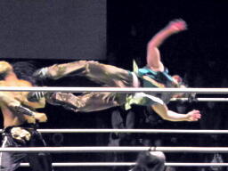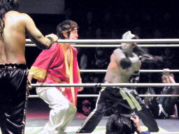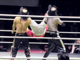 金角銀角悟浄をダブルでロープに振る、悟浄クローズラインをかわす、八戒がスワンダイブ式トルニージョ(右写真)。悟浄がニールキック、八戒ジャックナイフ、カウント2。