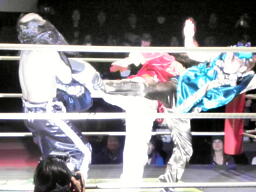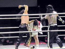 金角も入ってダブルでロープに振るが悟空クローズラインをかわして2人にドロップキック(右写真)、悟浄にタッチ。