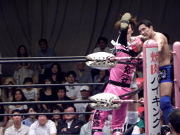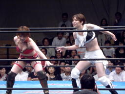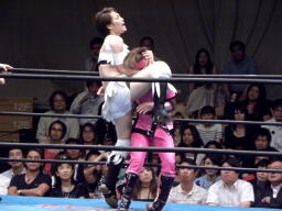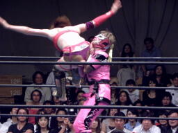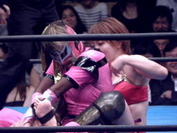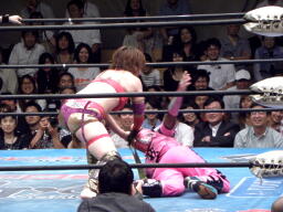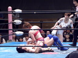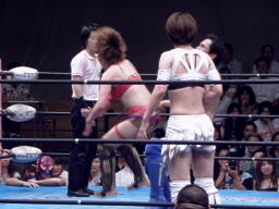 華名「お尻行くぞー!」とロープに振ってジャンピングヒップアタック(左写真)。カバー、冨宅入って乱丸にキック。か、カットしたのか?