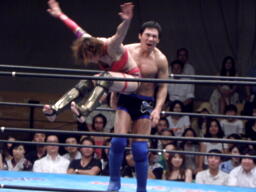 さらにジャンピングヒップアタック、冨宅喜んで受けているような(右写真)。