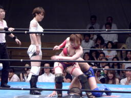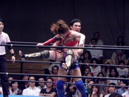 高い打点のヒザ蹴りを連打(右写真)、そしてジャンピングニー、カウント2。さらにヒザ蹴り連打、ネックロック。乱丸「タカちゃん・・・」亜沙美は華名にタッチ。