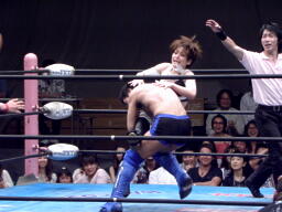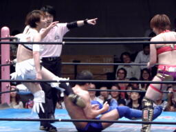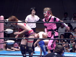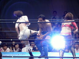 華名キーロック、「タカちゃん、カットして!」(右写真)冨宅動かない。乱丸が足を伸ばすとすぐそこにロープ華名サッカーボールキック、亜沙美にタッチ。。
