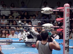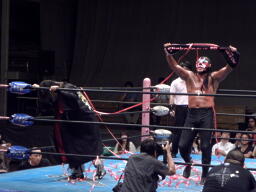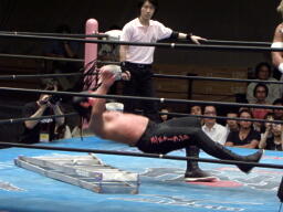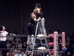 クーガーはリングサイドにイスを2つ置いてそこにラダーを渡し、MIKAMIをコーナーに上げて投げ落とそうとする(右写真)。