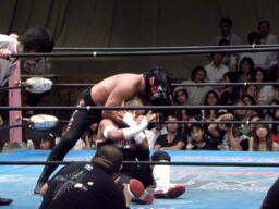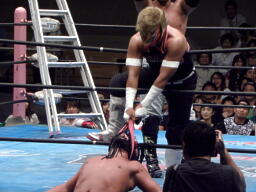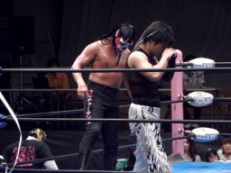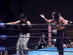 MIKAMIとダブルのチョップ(左写真)、サスケカバー、カウント2。再度ロープに振ってダブルのエルボーからハイファイヴエルボードロップ、サスケカバー、カウント2。