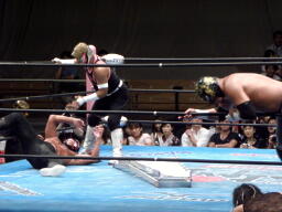 ミラクルがMIKAMIにラダーを投げつける。ダウンしたところにクーガーがギロチンドロップ(左写真)、カウント2。