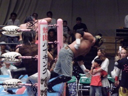 クーガー串刺しエルボーからコーナーに上るがサスケが阻止(左写真)、場外に落とす。