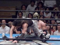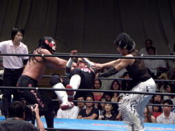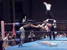 さらにミラクルはラダーからトペ・コン・ヒーロ(左写真)。2人をリングに戻しダブルカバー、両方ともカウント2。