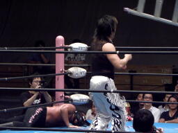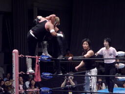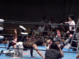 ミラクルがMIKAMIに延髄蹴り(左写真)、MIKAMI場外転落。