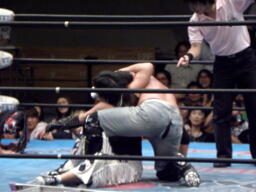 サスケミラクルにエルボーからスリーパー(右写真)、MIKAMIがストンピングで加勢。
