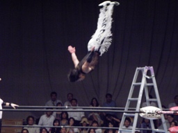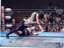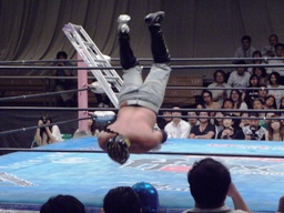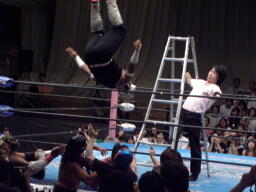 クーガーがMIKAMIをラダーに振る、MIKAMI飛び乗ってムーンサルトアタック(右写真)、カウント2。