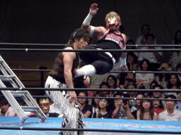 ミラクルがラダーの上にイスを積んでミラクルドライバー(右写真)、MIKAMIがカット。