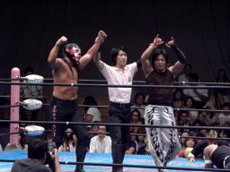 勝ち名乗りを受ける(左写真)。ミラクル「大阪のリングで好き勝手やりやがって。一回じゃ終わらさんぞ。何か理由付けてやってやる。」