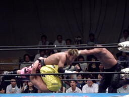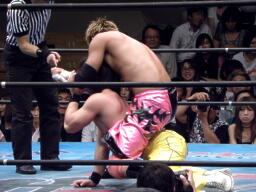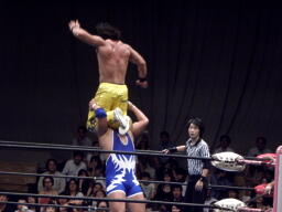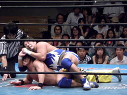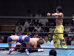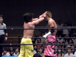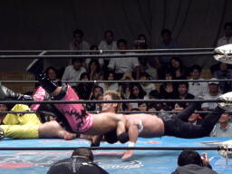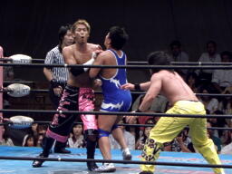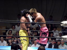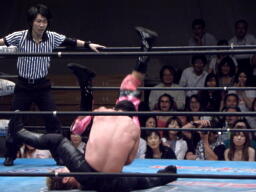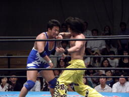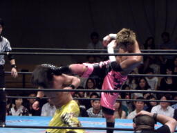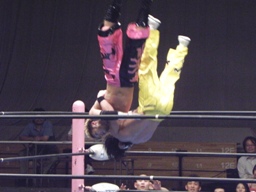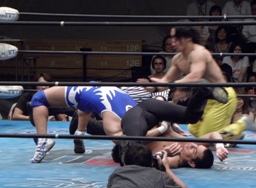 小峠キャメルクラッチ(右写真)、石森ロープ。小峠は原田にタッチ。