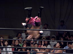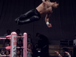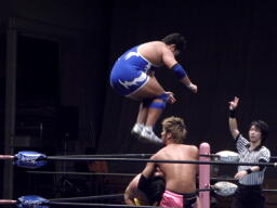 ダブルのドロップキックで石森を場外に落とすと小峠がトペ・コン・ヒーロ(左写真)。石森をリングに戻し原田がカバー、カウント2。