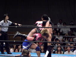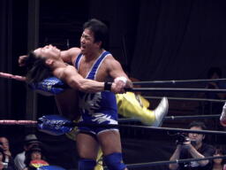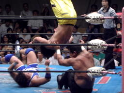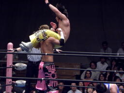 マルビン原田をリングに戻しコーナーに振る、原田切り返しコーナーにぶつける、さらに石森をベリートゥベリーでマルビンに投げつける(右写真)。石森をカバー、カウント2。