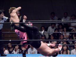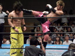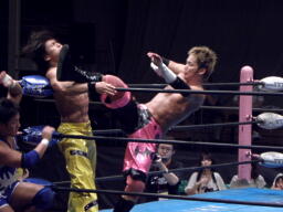 原田ロープに振る、石森ハンドスプリング式ハイキック(右写真)、カウント2。