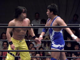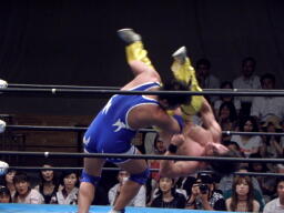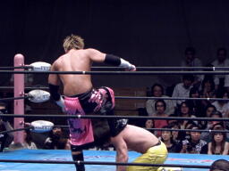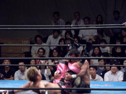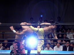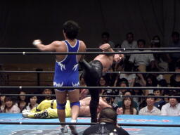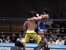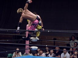 原田と石森チョップの打ち合い(左写真)、張り手の打ち合い。原田エルボー、小峠にタッチ。原田はまたマルビンに体当たり、場外に落とす。