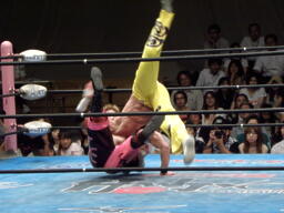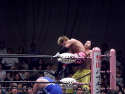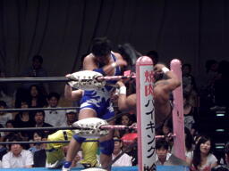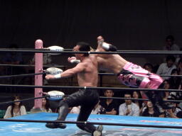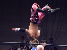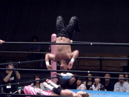 ロープワーク、マルビンリング下に出て小峠の足を引っ張って倒すとセカンドロープに飛び乗ってライオンサルト(右写真)。さらにスイングDDT、小峠場外エスケープ。