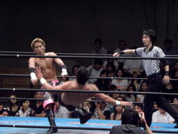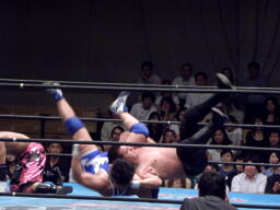 ダブルのトラースキック(右写真)、石森がカバー、カウント2。