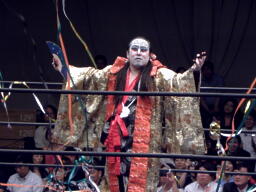 えべっさんとくいしんぼうの長い入場の後に流れた健介のテーマを聞いてビビる勘十郎とタコヤキーダー(左写真)。