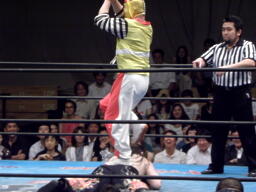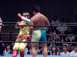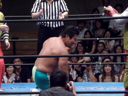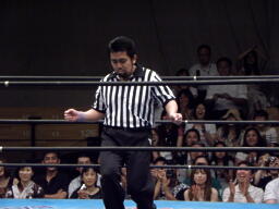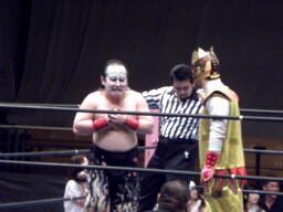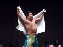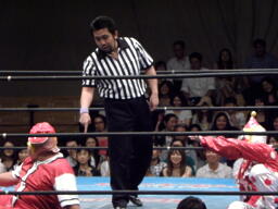 松井レフェリーも投げる(左写真)。健介も投げる。