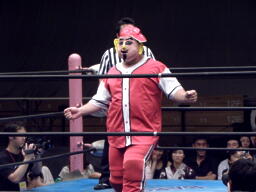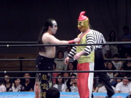 タコヤキーダーはコーナーに逃げ帰るが勘十郎も菊タローもタッチ拒否(左写真)。健介はくいしんぼうにタッチ。すると菊タローがタコヤキーダーのタッチを受ける。