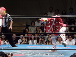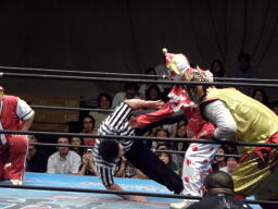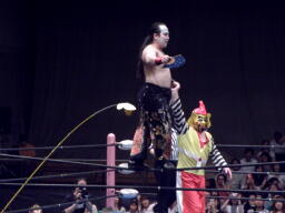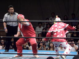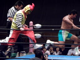 ピピピピピーッとけたたましく笛を吹いてタコヤキーダーを止めるとドロップキック(左写真)。勘十郎とくいしんぼうにタッチ。