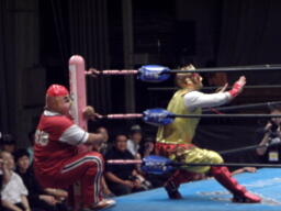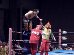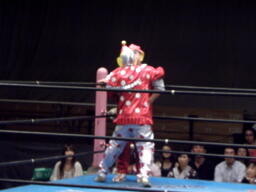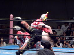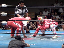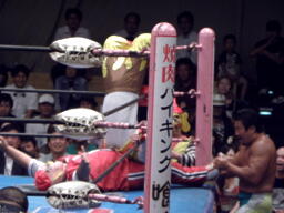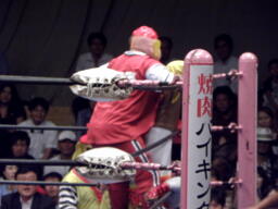 タコヤキーダーチョップ(左写真)、ロープに飛ぶ。