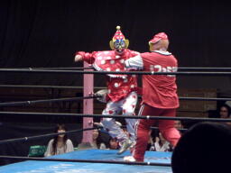 勘十郎とえべっさんにタッチ。勘十郎ガットショット、えべっさんあえなくダウン。立ち上がる「えべっさんですよー」(左写真)なんだこの空気。