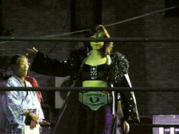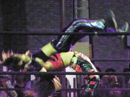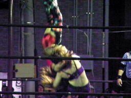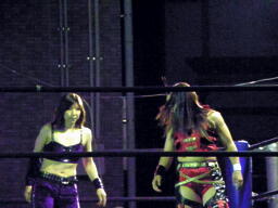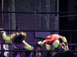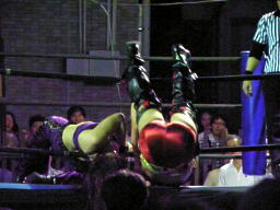 KAORUコーナーに上ってムーンサルトプレス(右写真)、カウント3。