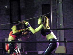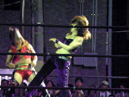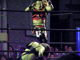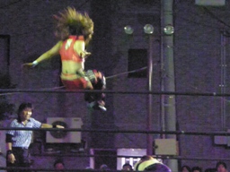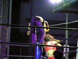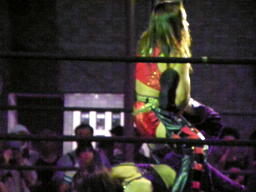 KAORUムーンサルトプレス狙ってコーナーに上る、植松阻止(左写真)。