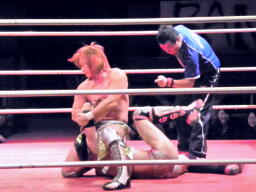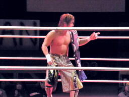 谷嵜は自分の名前の入ったのぼり?を肩にかけて入場(右写真)。コスチュームといい姿勢といいなんか佐野直っぽい。