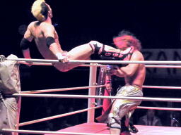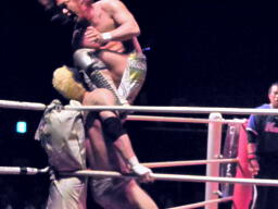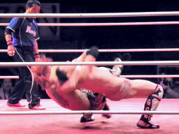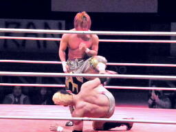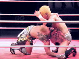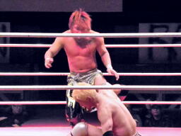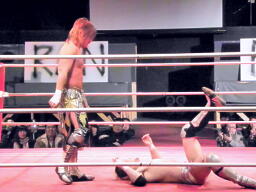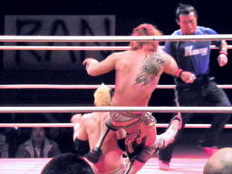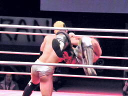 谷嵜DH、忍首固め、カウント2。谷嵜ヒザ蹴り、インプラント狙う、忍ブロックして逆さ押さえ込み、これも2。谷嵜カサノヴァ(右写真)、カウント2。