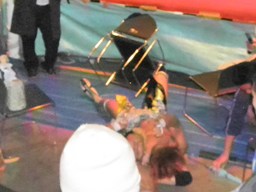 忍がフロアでブレーンバスター狙う、谷嵜切り返す。(左写真)。