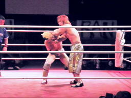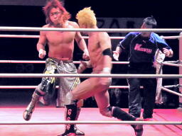 忍エルボー(左写真)、谷嵜ヒザ蹴りの打ち合い。