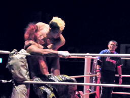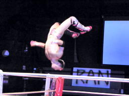 谷嵜イス攻撃(右写真)、先にリングに戻る。