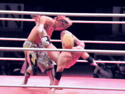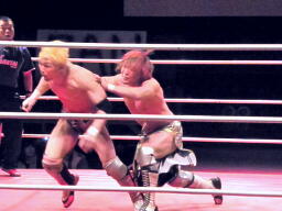 忍ロープに飛ぶ、谷嵜カウンターのエルボー。谷嵜ブレーンバスター狙う、忍ブロックして返す(右写真)。
