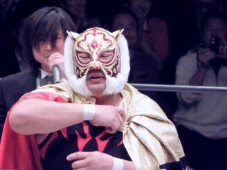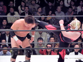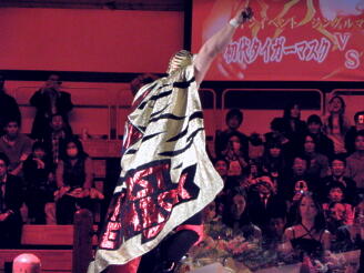 タイガーのキックが顔面に(右写真)、天龍は場外エスケープ。タイガープランチャ、天龍は下からイスを投げつける。5分経過。
