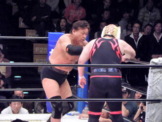天龍はタイガーを立たせると逆水平連打(右写真)で倒しエルボードロップ、カウント2。