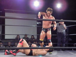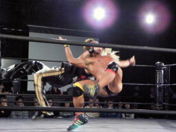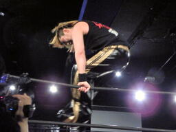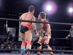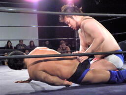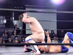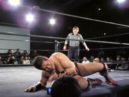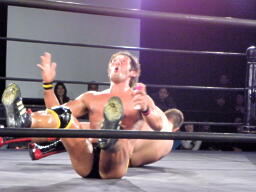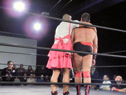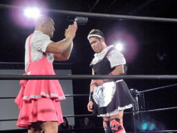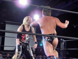 冨宅がマイケルとロックアップしようとするが滑る(右写真)。マイケル「つかめまい!」ストンピング。
