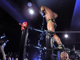 マイケルの張り手によって顔がローションまみれになった冨宅はエプロンに逃げるがマイケルはコーナーに上ってマーライオン(右写真)。