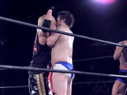 ストンピングからナイトメア(左写真)、戻ってきたFUJITAがカット。FUJITAはディーノからズボンを取り返し着用。