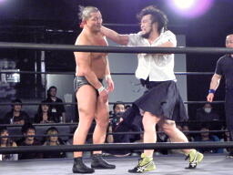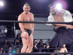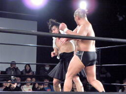 ゴングが鳴らされ佐藤が鈴木の首筋にチョップ(左写真)、鈴木張り手、佐藤ダウン。