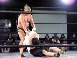 鈴木「お前みたいなクソみたいなレスラーがよく10年もやりやがったな。お前ごときクソどインディーレスラーが生意気にこんな大会開いてるんじゃねぇよ。お前みたいな奴のためにこんなに人が集まったじゃねぇか。まぁ数年前に俺に喧嘩を売ってきた落とし前と、あとはまぁお祝いってことで。この後こいつの10周年とかけて鈴木みのる新Tシャツ発売記念サイン会やりまーす。」鈴木退場。