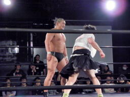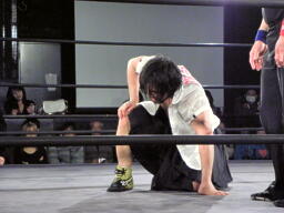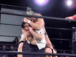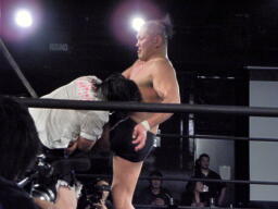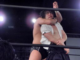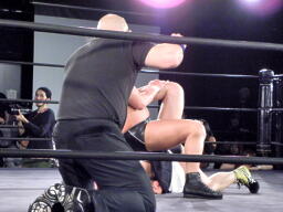 鈴木ヒザ蹴りから逆片エビ固め(右写真)、佐藤ロープ。